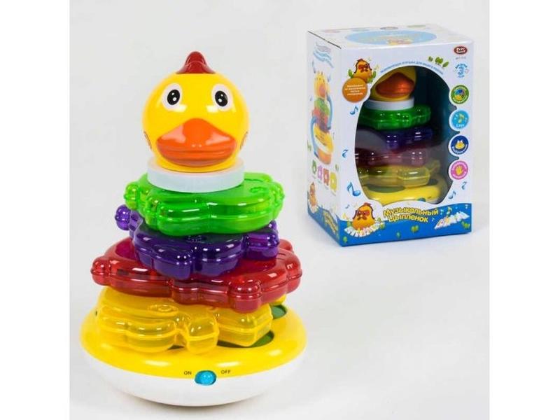 Чудо-пірамідка, 3в1 (неваляшка, пірамідка, брязкальце). Розвиваюча іграшка пірамідка - цікава розвиваюча дитяча іграшка з музичним і світловим супроводом. Її відрізняє прекрасний яскравий дизайн у формі качки і курчати, а також безпечні для дитини матеріали, з яких виготовлені кільця пірамідки, що їх навіть дуже приємно буде гризти малюкові і використовувати, як прорізувачі зубок. Малюк, граючи з іграшкою, розвине моторику і розумові здібності: навчиться розрізняти кольори, зіставляти форму і розмір. 2 види. Джерело живлення: батарейки. У коробці 26-18-16 см. Країна виробництва: Китай Матеріал: пластик. Вік: від 6 міс.