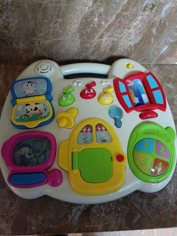 іграшка працює від 3 пальчикових батареї. багато функцій які відтворюють музичні звуки. моїй малечі дуже подобалося нею гратися.