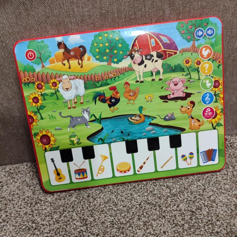 детский планшет. издает звуки животных и инструментов. работает от батареек.