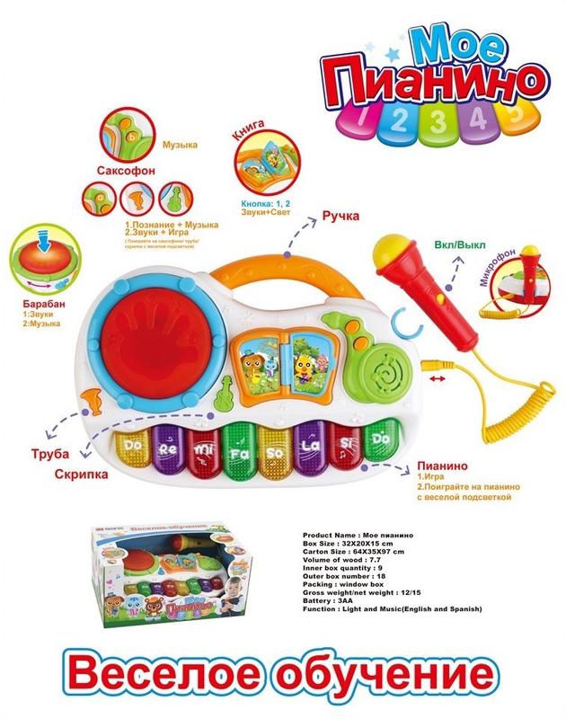 Пианино с микрофоном - музыкальная развивающая игрушка для малышей. Игра представляет собой целый музыкальный центр. Помимо пианино, в набор входит микрофон. В арсенале игрушки книга, которая со звуковыми и световыми эффектами, барабан, при нажатии которого, Вы услышите музыку. Нажав на кнопки труба и скрипка, Вы услышите соответствующие данным инструментам звуки. Так же имеется удобная ручка для передвижения с игрушкой. Клавиши пианино светятся, что непременно будет привлекать внимание ребенка. Играя, он будет тренировать моторику рук, зрение, слух и координацию. Материал: пластик Тип питания: батарейки есть звуковые эффекты Возраст: от 12 месецев