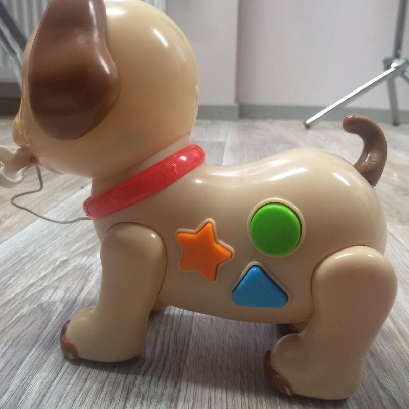 песик, работает от батареек, издает звуки при нажатии на кнопки лает и играет мелодии, косточка вынимается, можно возить, имеет колесики