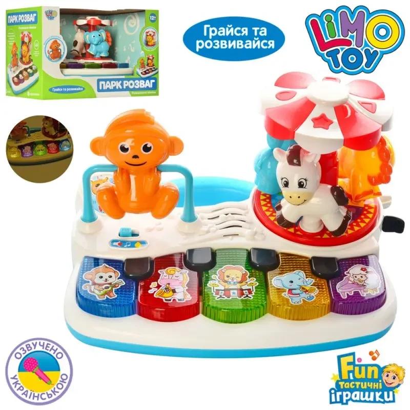 Розвиваюча іграшка "Піаніно. Парк розваг" Limo Toy - цікава музична іграшка зі звуками тварин, веселими мелодіями, віршиками, каруселлю, яка обертається, рухомою фігуркою мавпочки, а також клавішами, які світяться, неодмінно подарує море позитивних емоцій вашій дитині. Це чудова, якісна навчальна іграшка сприяє розвитку дрібної моторики, колірного і звукового сприйняття, уяви і логічного мислення. Іграшка має два режими гри: - Режим "Піаніно". Перемістивши кнопку включення по центру, дитина буде з інтересом грати на піаніно, а також будуть світитися клавіші. - Режим "Навчання". Перемістивши кнопку включення в праву сторону, дитина перейде в режим навчання. В даному режимі, натиснувши на клавішу дитина почує назву тварини, яка зображена на ній. При наступному натисканні прозвучить веселий вірш, а при третьому натисканні, буде звучати музика. Під час кожного натискання на клавіші дитину будуть забавляти світлові ефекти. Натисніть кнопку на каруселі і ви почуєте п'ять енергійних мелодій. Вік: від 12 міс. Розмір іграшки: 25х17х14,5 см. Розмір упаковки: 30х18,5х18,5 см.