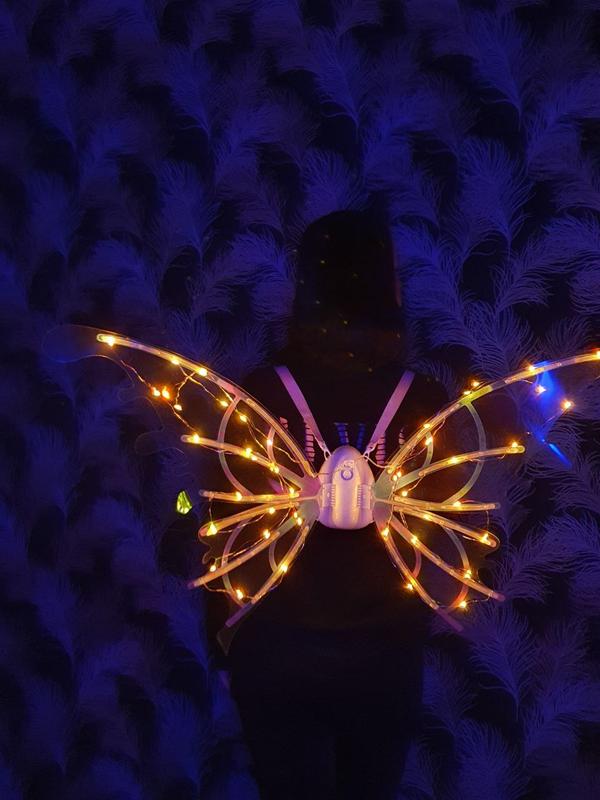 Подаруйте своїй дитині казку. Вона їй точно сподобається. Рухомі крила метелика чи феї. Є декілька режимів роботи : рухомий режим з підсвіткою і музикою та рухомий режим з підсвіткою без музики. Можна також носити виключним. Висота лямок регулюється.