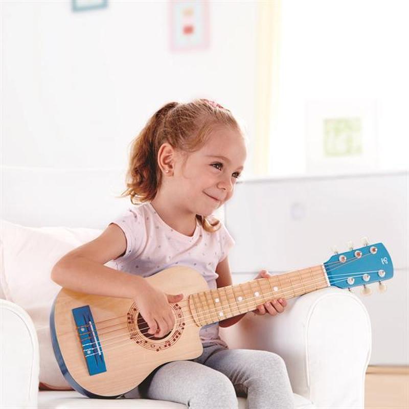 Дитяча гітара Hape Лагуна синього кольору більше пасуватиме хлопчикам від 3 років. Її розмір адаптований для дітей молодшого віку. Грай, вигадуй, покращуй свої слухові навички або скористайся інструкціями, щоб оволодіти основами гри на гітарі. Нейлонові струни кріпляться до дерев'яної основи таким чином, щоб убезпечити дитячі пальчики. Розмір дитячої гітари: 65 х 21 х 6 см. Дитяча гітара Hape Лагуна, синій (E0601) відповідає міжнародним стандартам якості EN 71 і ASTM F963.