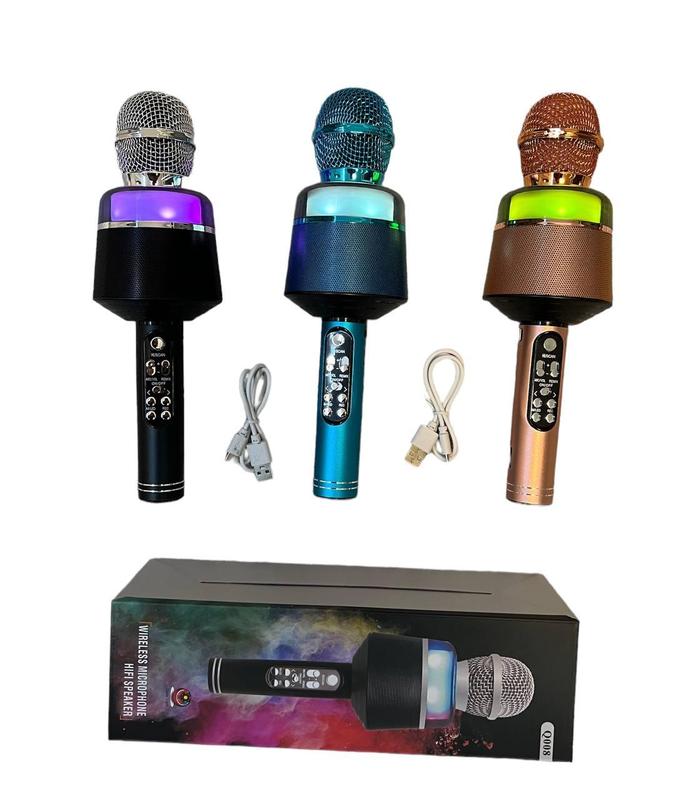 Мікрофон з функцією караоке, 3 кольори. Звукові ефекти. Безпровідний мікрофон і колонки, два в одному. Головка мікрофона має три обробки зменшення шумів. Версія Bluetooth - V4.0 + EDR. Відстань підключення - 10 м. Потужність спікера - 5 W. Інтерфейс - 3,5 мм (навушники), Micro USB, TF слот для карти, USB. Робочий час - 5-8 год. Живлення акумулятор 3.7v, 1800 mAh. Матеріал - комбінований. Упаковка - коробка.