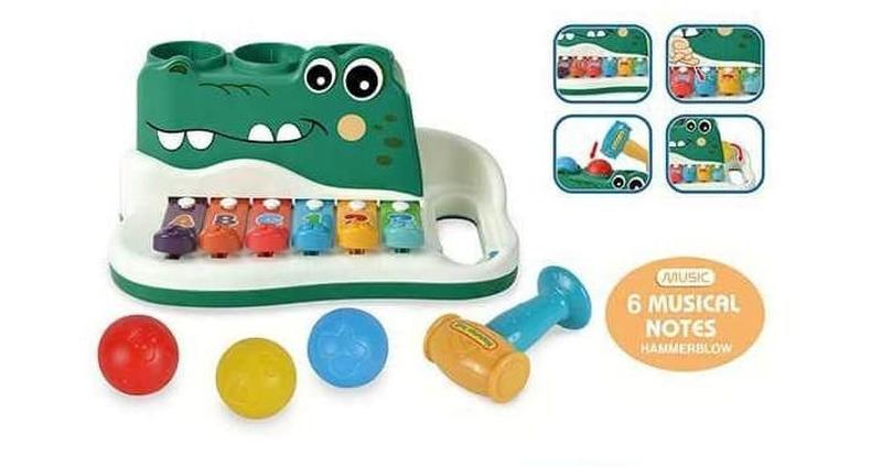 Детский ксилофон "Крокодил" с молотком Классический ксилофон, который так нравится малышам, приобрел еще более интересный и оригинальный вид. Знакомый детям функционал дополнился яркой стучалкой, а сам ксилофон теперь воспроизводит ноты без помощи палочек, сменив их на цветные рычаги. Игрушка познакомит ребенка с нотами, научит различать цвета, считать от 1 до 3, станет отличным тренажером для развития мелкой моторики, координации движений и логического мышления. Особенности: - яркий корпус в стильном дизайне; - имеет вид крокодильчика; - игрушка сочетает сразу 2 игры: ксилофон и стучалку; - при попадании шарика на одну из 3-х кнопок, игрушка воспроизводит звук; - в комплекте представлен яркий молоточек; - разноцветные пластины ксилофона украшены буквами и цифрами; - ксилофон воспроизводит ноты при нажатии на рычаги; - игрушка изготовлена из качественных материалов, безопасных для здоровья ребенка.