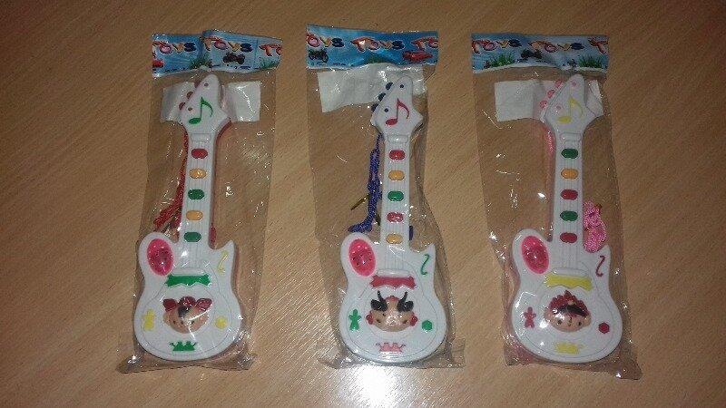 Детская музыкальная гитара на батарейках, материал пластик, на верёвочке, длина 20см, Новая, в упаковке. Батарейки в комплект не входят!!!