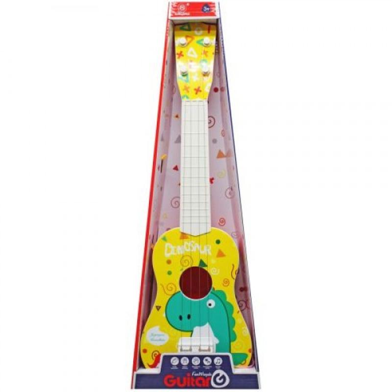 Чотириструнна гітара (укулеле), маленький дублікат справжнього інструменту. Має м'які пластикові струни різної товщини та кілки, які регулюють їх натяг. Розмір іграшки 52 х 16.5 х 6 см. Виготовлена з міцного пластику з яскравим принтом. Для дітей від 3 років.