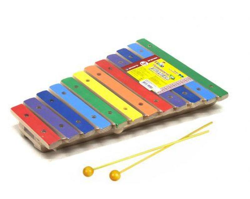 Ксилофон дерев'яний (12 тонів). Ксилофон - ударний музичний інструмент з певною висотою звучання. Являє собою ряд дерев'яних брусків різної величини, налаштованих на певні ноти. По брусках вдаряють паличками з кулястими наконечниками. Бренд: Руді Упаковка: Пакет Колір: Різнобарв'я Країна виробник: Україна Матеріал: Дерево Комплектація: Ксилофон