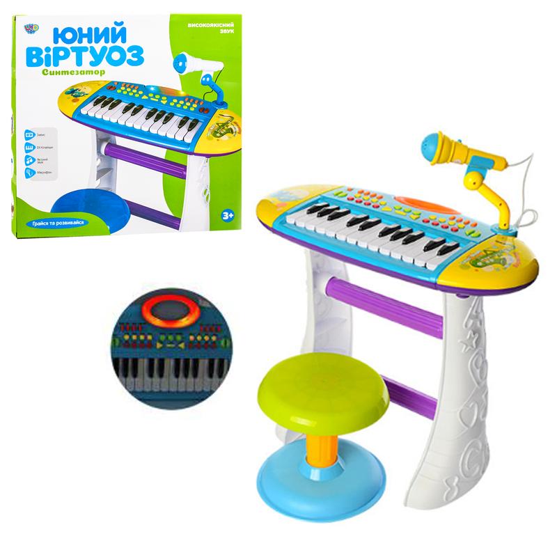 Дитячий синтезатор зі стільчиком. Музичний інструмент з мікрофоном, звуковити та світловими ефектами. Регулятор гучності. Вік - від 2 років. Матеріал - пластик. Живлення - батарейка АА. Упаковка - коробка. Розмір - 49х11х48 см.