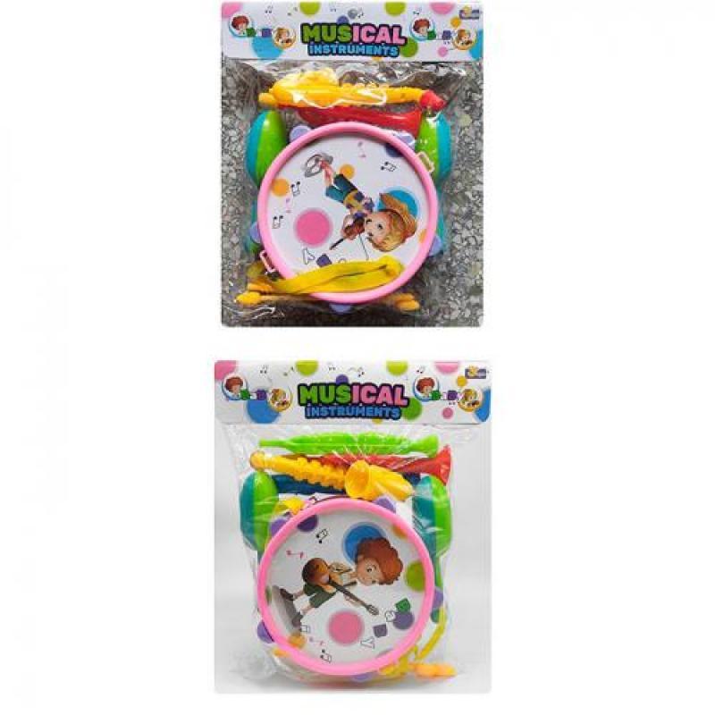 Набір іграшок "Музичні інструменти", 18 см, 2види. Барабан, 2 палички, дудки та маракаси. Матеріал - пластик. Упаковка - пакет. Розмір - 27х9х30 см.