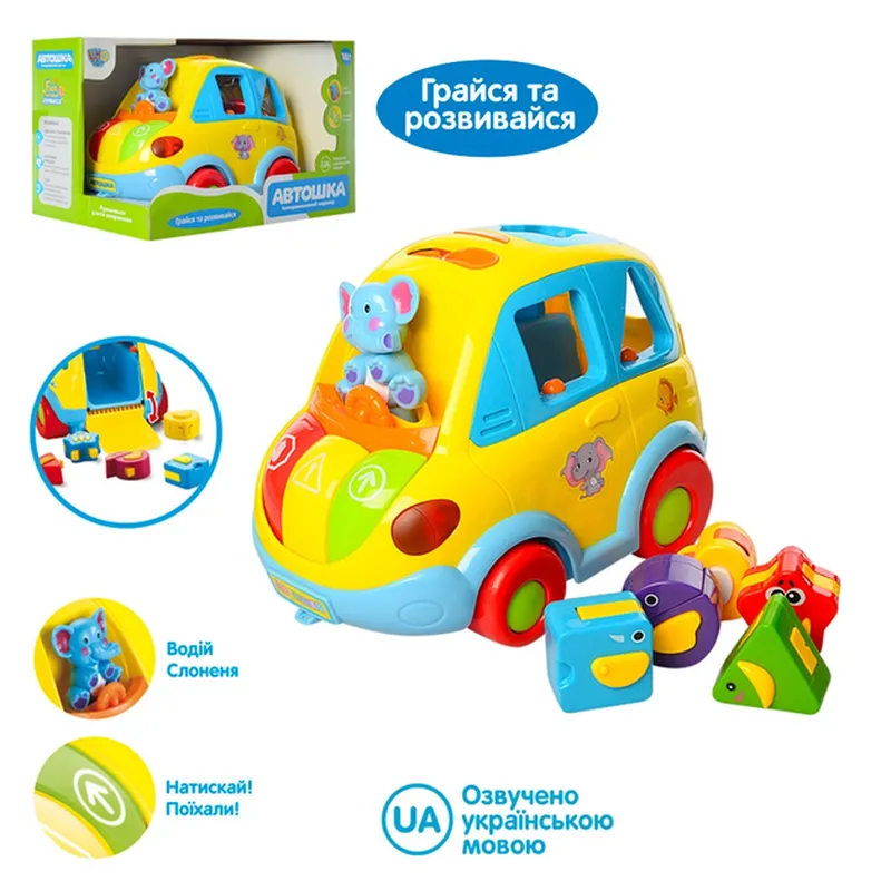 Машинка самостоятельно ездит по комнате, объезжая все препятствия, которые встречаются ей на пути, и поет веселую песенку о правилах дорожного движения. Водитель - слоненок забавно качается в такт музыки при движении игрушки. Машинку можно использовать как игрушку-каталку (в комплект входит шнурок для катания). Нажимая на разноцветные кнопки, ребенок изучает цвета светофора и узнает, что нужно делать, когда светится определенный цвет. В комплекте 5 геометрических фигурок, которые превращаются в 5 видов животных: - звезда-лягушка, - коло-пташка, - сердце-конячка, - треугольник-рыбка, - квадрат-слоник. Установив фигурку в соответствующую форму, ребенок услышит голос животного, спрятанного в этой фигурке. Размер машинки - 21 см. Питание: 3 батарейки типа АА (в комплект не входят) Материал: пластик. Упаковка - коробка. Размер упаковки: 26 - 17 - 17,5 см; Упаковка: коробка; Возрастная категория: 12 мес+