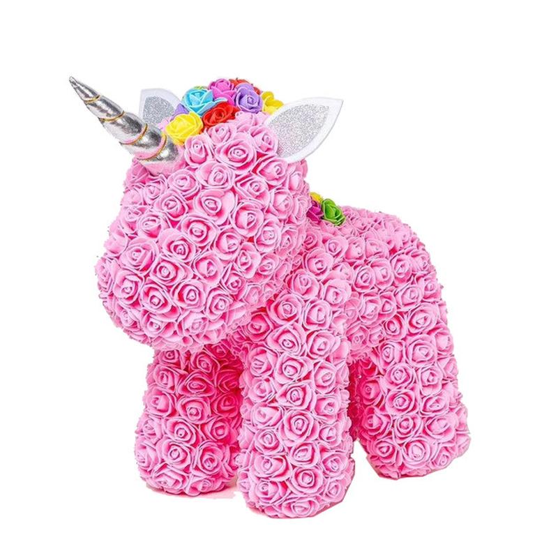 Іграшка єдиноріг зі штучних квітів троянд у подарунковій коробці el-2175