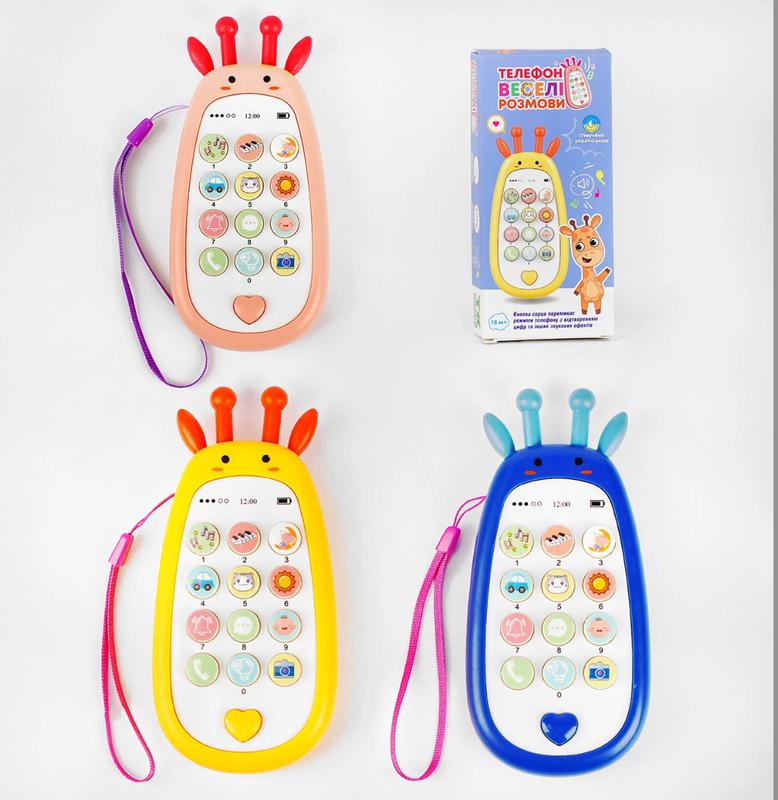 Знайомство дитини з новою іграшкою “Веселі розмови” від українського виробника почнеться цікаво та захопливо. Дизайн телефона розроблений спеціально для малечі віком від 18 місяців: його легко тримати в ручках, він забарвлений у приємні оку пастельні кольори, має дуже симпатичний дизайн та оснащений прорізувачем. Іграшка спрямована на розвиток логічного мислення, дрібної моторики, сприйняття звуків, вивчення кольорів, нових слів та цифр. Особливості: - телефон виконаний у формі жирафи; - вушка та ріжки виготовлені з еластичного матеріалу та виконують роль прорізувача; - іграшка працює від 2-х батарейок типу “ААА” (не додаються); - підсвічується приємними кольорами; - приємний на дотик та має скруглену форму; - виготовлений з якісного первинного пластику; - у комплекті представлений зручний шнурочок для тримання в руці; - натискання на “сердечко” перемикає 2 режими роботи телефона: цифри та звукові ефекти; - на передній панелі розташовані 13 функціональних кнопок: 1 - пісні українською мовою; 2 - інструментальні мелодії; 3 - колискова мелодія; 4 - назви автомобілів; 5 - назви тварин; 6 - вивчення кольорів; 7 - відтворення дзвінка рідних; 8 - звук повідомлення; 9 - казки українською мовою; 10 - рінгтон; 11 - веселі мелодії; 12 - звук фотозйомки; 13 - перемикання режимів. Матеріал : Виробник : -
