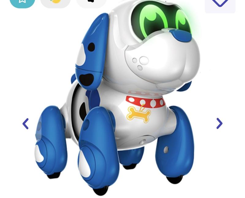 Собака выполняет различные движения: оезжает вправо или влево, если прикоснуться к сенсорным датчикам по бокам головы; э движется вперед при нажатии двумя пальцами на голову; e издает реалистичные звуки, если прикоснуться к груди питомца У собаки светятся глаза. Игрушка изготовлена из безопасного и устойчивого к повреждениям пластика высокого качества. Для работы собаки нужно приобрести 2 элемента типа АА. состояние хорошее все работает. коробки нет