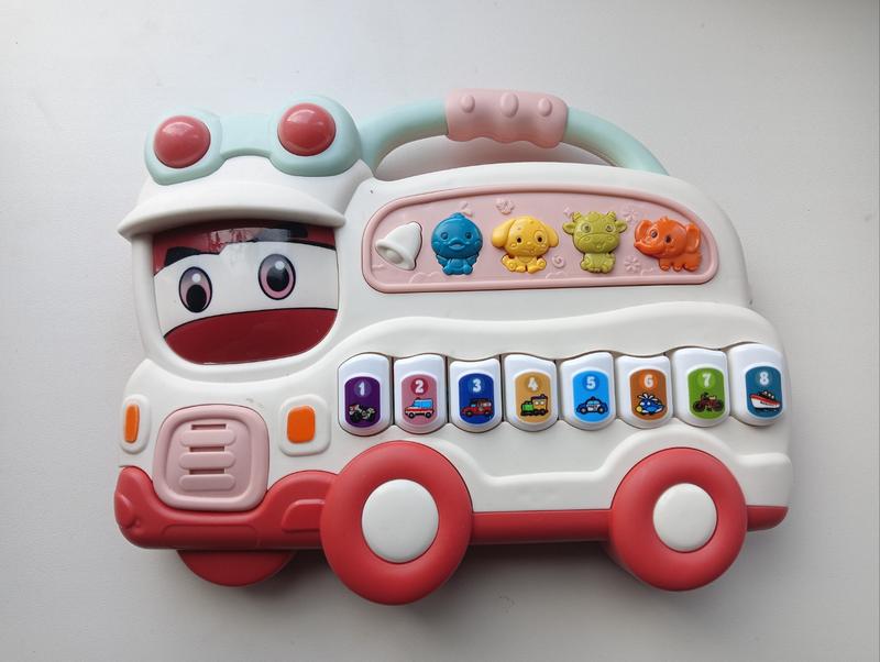 Продам музыкальное пианино, есть несколько режимов (песенки, звуки животных и машин, цифры), регулируется громкость, на батарейках (требу заменить), по недостаткам - не работает одна кнопка