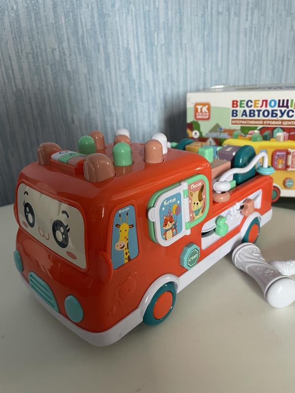Дитяча розвиваюча іграшка Веселощі в автобусі. Розповідає казки, співає пісні, має 1 гру молоточок в комплекті, всі деталі на місці, все працює. З нюансів трішки стерся зайчик (на фото видно).