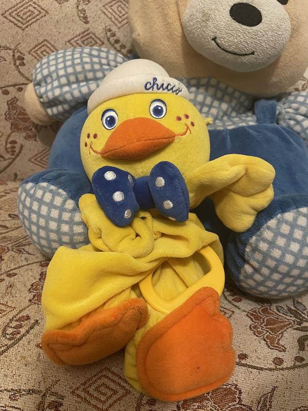 Красива музична рідкісна фірмова іграшка Утенк Chicco, яскрава і якісна, виконана з велюру, наповнювач — холофайбе, в голові музичний механізм, між лапками пластикове кільце, розтягнувши його до упору — каченя починає скорочуватися і грає дуже красива музика. Не використовували.