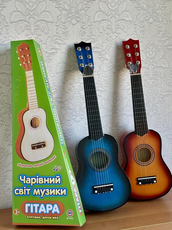 Деревʼяна гітара для дітей. Така гітара з медітатором обов’язково сподобається юному музиканту. Класична акустична шестиструнна гітара. Містить металеві струни, шпильки, які регулюють натяг струн. Довжина гітари 53 см . В комплекті запасна струна . Відмінне звучання. Розмір упаковки 53,5-20-6,5 см