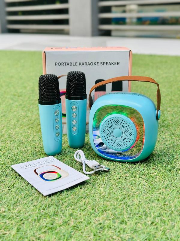 В комплект входит колонка с цветной подсветкой и два беспроводных микрофонами. ❤️Портативная колонка имеет удобную ручку для переноски, позволяющую брать ее с собой куда угодно. 🌈 Яркая подсветка добавляет атмосферности, а чистый звук гарантирует удовольствие от прослушивания. 🎙️ имеют кнопки управления колонкой для удобства использования. 📌Особенности: 📍размеры колонки: 11х7х11 см; 📍колонка работает от встроенного аккумулятора (зарядное устройство USB type-c в комплекте); 📍колонка подсвечивается при работе (11 режимов + режим без подсветки); 📌 колонка поддерживает технологию bluetooth, но также имеет слот для карты памяти; 📍колонка имеет AUX разъем; 📍максимальное расстояние передачи сигнала bluetooth: 10 м; 📍микрофон работает от встроенного аккумулятора (зарядное устройство USB type-c в комплекте); 📍переключения песен и изменение их громкости можно выполнять с помощью кнопок на микрофоне; - микрофон имеет 5 режимов смены голоса.