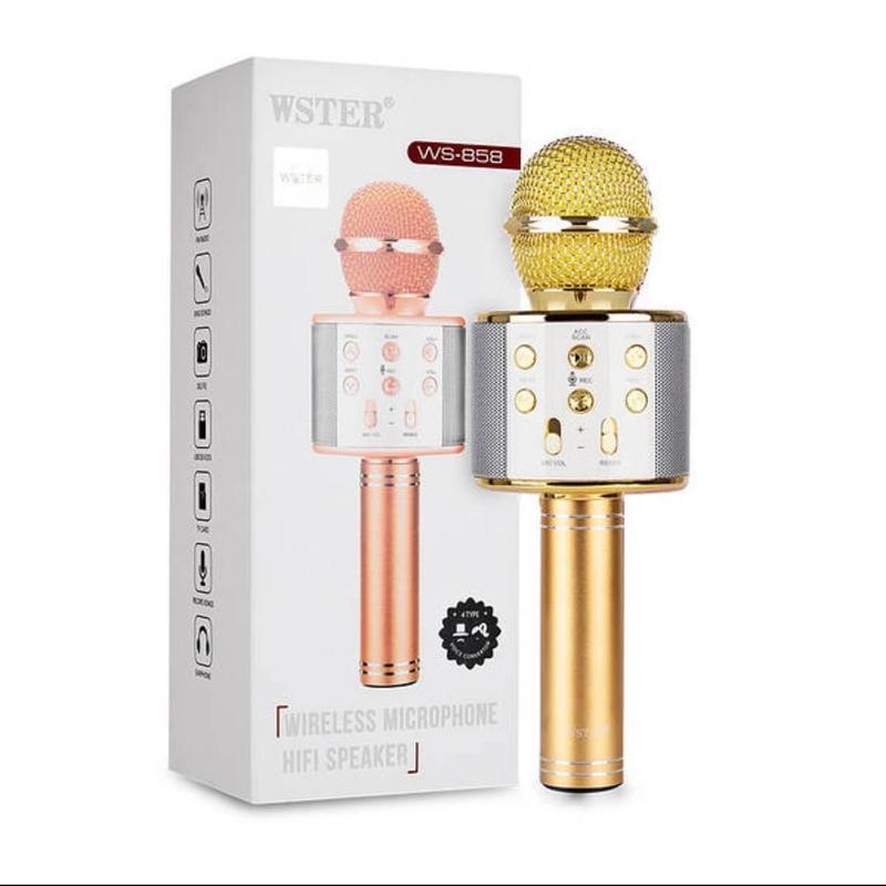 Детский ручной Bluetooth караоке микрофон Wster WS-858 и портативная MP 3 колонка 2в1 Розовый Вы любите петь? Тогда беспроводной микрофон, это то, что Вам просто необходимо! Веселая компания, любимые песни и классное караоке - это то, что подымет настроение, сделает жизнь яркой и насыщенной и оставит воспоминания надолго. Wster WS-858 - это праздник, веселье и хорошее настроение! Wster WS-858 - это 2 в 1 - динамик и микрофон. Вы можете использовать данное устройство как плеер или караоке-микрофон в комбинации со смартфоном. Соединение со смартфоном через Bluetooth. Модель WS-858 оснащена беспроводным модулем Bluetooth, слотом USB и microUSB для чтения музыкальных файлов.. Объединение в одном устройстве микрофона и динамика позволяет одновременно проигрывать музыкальные треки со своего смартфона (или любого гаджета, работающего через Bluetooth). Вы сможете не только петь любимые песни, но и записывать собственные - для этого предназначен специальный кабель, подключаемый к устройству. А при помощи регуляторов Вы сможете настроить звучание. Батареи караоке-микрофона ёмкостью 1800mAh хватит на 5 часов весёлого пения Особенности: - Беспроводная связь по Bluetooth универсально совместима с Android, iOS телефонами - Трехуровневое подавление уровня шума в головке микрофона, направленный микрофон - Проигрывает музыку со смартфона и позволяет петь под них, записывая свои композиции (встроенный слот для карты памяти для записи музыки в формате MP3) - Вы можете выбирать различные звуковые эффекты (например, эхо), удобное расположение кнопок для регулировки режимов - Компактный и довольно легкий микрофон легко помещается в небольшую сумку - Можно использовать как обычную портативную колонку для проигрывания музыки со смартфона или планшета - Модель имеет разъём для подключения наушников (удобно для людей, занимающихся вокалом) - Современный протокол Bluetooth 4.0 обеспечивает снижение потребления энергии при более стабильном соединение и скорости передачи сигнала на расстоянии до 10 метров - Металлический корпус защищенный от ударов и падений способствует высокому качеству звучания и лучшим басам, три стильные расцветки - Широкий спектр применения: для пикника, поездки, вечеринки, семейные развлечения, пение в караоке и т. д. Технические характеристики: - Bluetooth 3.0 - Выходная Мощность: 10 мВт (выход на Наушники) 3 Вт (колонка) - Диапазон частот: от 100 Гц до 10 кГц - Режим реверберации: Эхо - Источник питания: встроенный литиевый аккумулятор - Емкость батареи: 1800 мАч - Время работы аккумулятора: от 3 до 5 часов - Питание: DC 5V - Металлический корпус, цвет розовое золото. - Поддержка Android и ios. Комплектация - микрофон - USB кабель - инструкция по эксплуатации