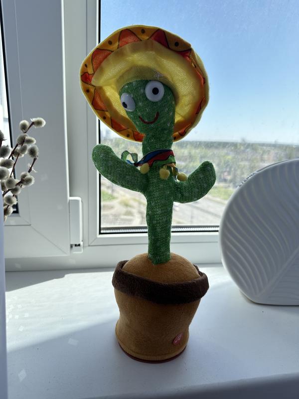 Інтерактивна дитяча іграшка повторюшка Танцюючий кактус. Іграшка танцює та співає, світиться і відтворює 120 мелодії. Так само вона здатна запам'ятовувати ваші слова і повторювати їх, смішно танцюючи при цьому. Записуючий пристрій у музичному кактусі запише будь-яку Вашу пропозицію, яку Ви скажете поряд з кактусом і через 1-2 секунди він повторить Ваші слова дуже смішним голосом і веселим танцем! Працює від акумулятора.