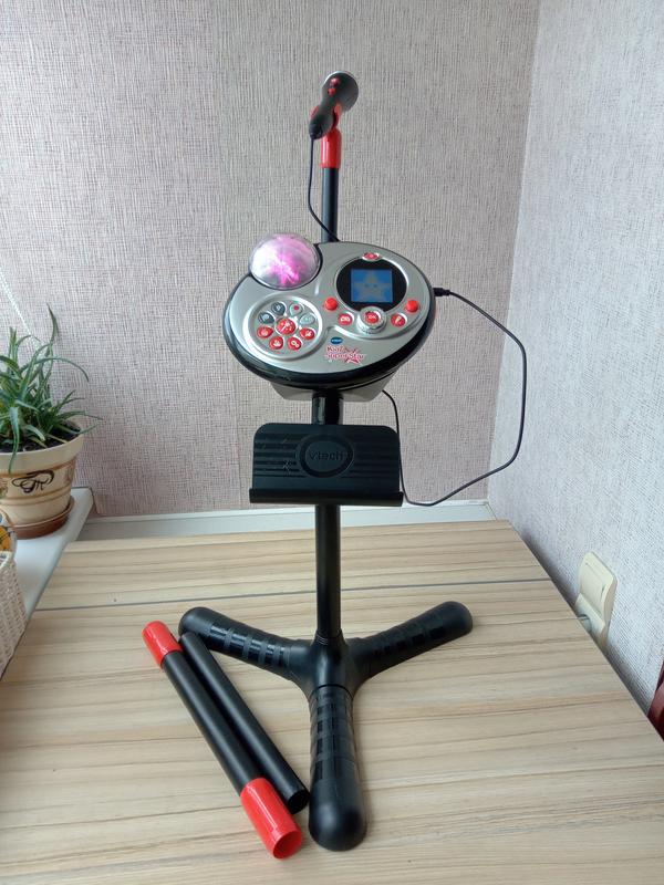 Караоке VTech Kidi Superstar Це реально потужна машина, з диско-вогнями, звуковими ефектами та вбудованим рекордером. Вона постачається в комплекті з міцними пластиковими штангами, які легко складаються, і ви отримуєте регульовану за висотою стійку. Плюс тримач для телефона або MP3-плеєра. У приладі є вісім оригінальних пісень. З інтерактивним дисплеєм зі світлом, який змінює анімацію залежно від музичного стилю. Запис голосу (до 4 хвилин) та деформація за допомогою кумедних ефектів. Мова англійська Стан дуже хороший, є незначні потертості Ціна: 800 грн