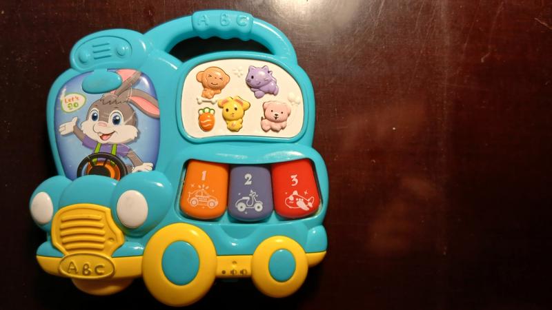 Музыкальная игрушка со световыми эффектами. Играет разные мелодии, звуки животных и транспорта. Все кнопки работают. Единственный нюанс не родная крышка в отсеке для батареек. Размеры: 17.3×5.4×18.3 см. Питание от 2х батареек типа АА, в комплект не входят. Музыкальная игрушка со световым эффектом, звуками животных и песен. Развивает координацию движений, концентрацию, внимание, мелкую моторику, слух и цветовое восприятие. Рекомендуется детям от 6 месяцев.