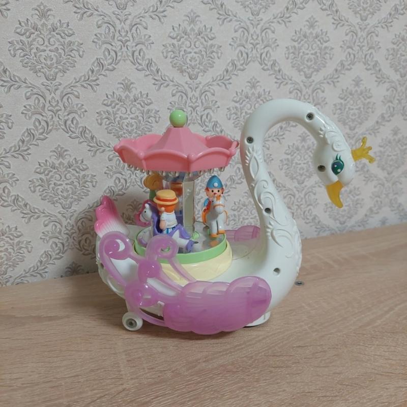 Музыкальная карусель в виде лебедя. Лебедь ездит, играет музыка, а карусель крутится. также есть световые эффекты. Может работать в режиме без музыки. Состояние отлично. Работает от батареек.