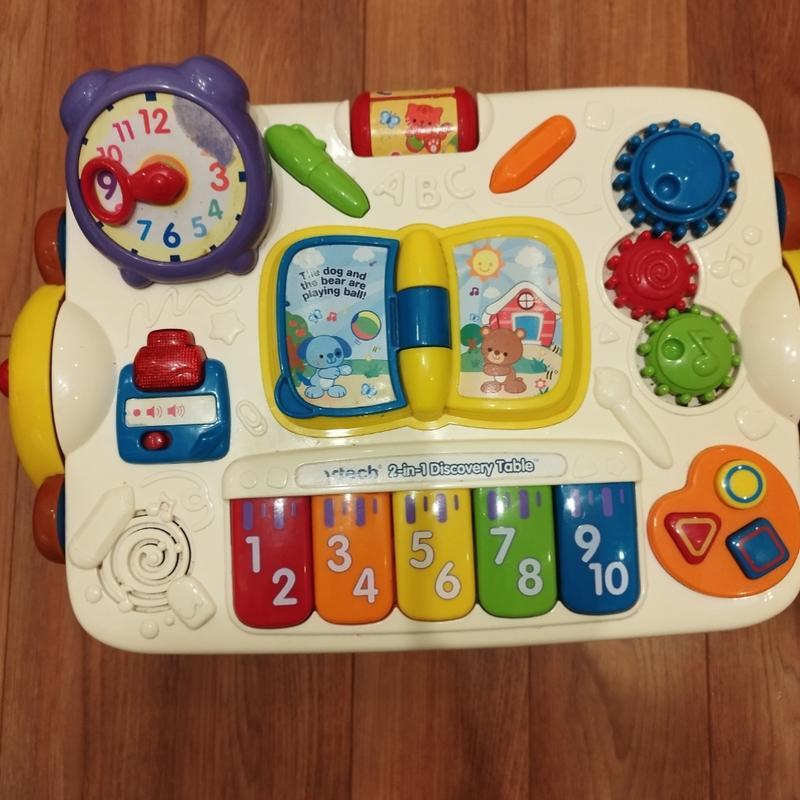 Обучение вдвойне приятное со столиком VTech 2-in-1 Discovery Table. Эта инновационная игрушка привлечёт Вашего малыша в процесс обучения с максимальным для него удовольствием, используя множество интересных упражнений. Стоит лишь перевернуть столик в режим мольберта, и ребенок с удовольствием изменит занятие на столь любимую детьми рисование. Развивающая часть оснащена линейкой клавиш пианино, книжкой, часами и разнообразными интерактивными кнопками. Этот учебный столик надолго задержит Вашего малыша, освобождая маме такое необходимое время:) Занимаясь с этим столиком, ребенок будет учиться распознавать размеры, цвета, цифры, развивать мелкую моторику. На английском языке, работает от двух батареек типа АА