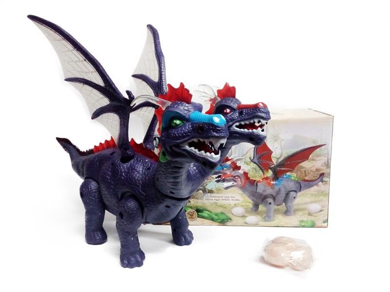 Большой двухголовый фиолетовый динозавр Dinosaurs Century "Two-Headed Dinosaur Can Lay Eggs" -- это интересная двигающаяся игрушка, с музыкальным сопровождением, подсветками и способностью нести яйца. Комплектация динозавра предоставляется в разобранном виде, и включает: - головы; - туловище; - два крыла; - хвост; - три яйца.