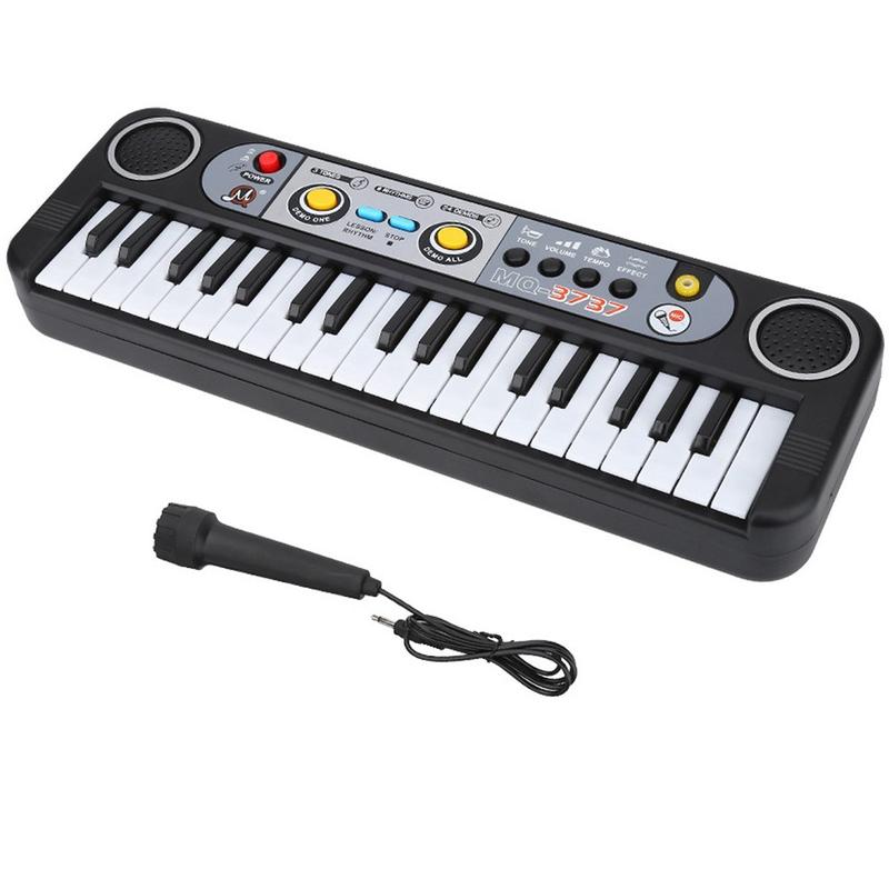 Клавиатура с 37 клавишами. Кнопка DEMO ONE ALL - для демонстрации музыки. Кнопка включения / выключения. Гнездо - выход для микрофона. Кнопка ритма. Кнопка СТОП. В комплекте: синтезатор, микрофон. Работает от 4 батареек АА (не входят в комплект). Размер синтезатора 33.5 * 4.5 * 11 см. Размер коробки 34 * 5 * 11.5 см.