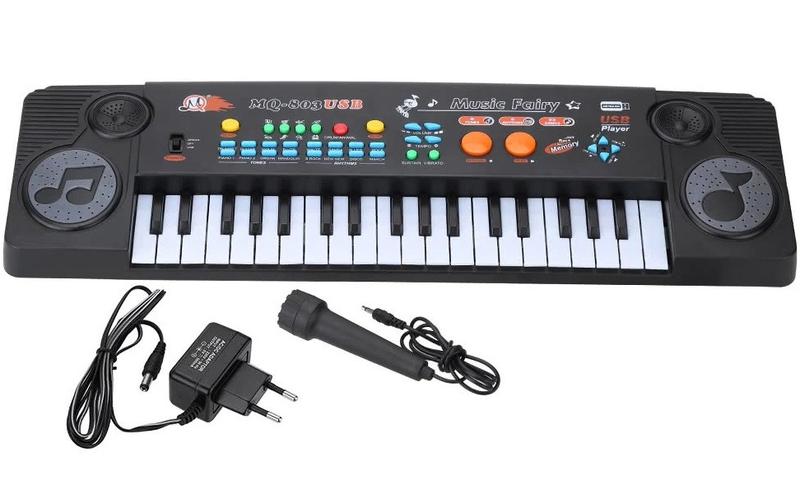 Детский синтезатор может стать отличным подарком для юного музыканта. С помощью 37 клавиш ребенок сможет не только проигрывать ноты, но и создавать собственные мелодии, записывать их и прослушивать. Благодаря микрофону у малыша также будет возможность петь в караоке. В синтезаторе предусмотрены различные звуковые эффекты, так есть 22 демо- мелодии, 8 музыкальных инструментов: гитара, пианино 1, флейта, пианино 2, волынка, труба, орган и мандолина, 8 ритмов: марш, вальс, самба, диско, блюз, рок 1, рок 2, голоса 4 животных: скворец, собака, утка, лягушка. А также возможность регулировки громкости, темпа и другие функции. В модели есть USB- разъем для подключения MP3 плеера. В синтезаторе один динамик, вторая колонка муляж. Комплектация: синтезатор, микрофон, сетевой адаптер. Синтезатор работает от сети или 4 батареек типа АА (в комплект не входят). Размер синтезатора 54 * 5 * 17 см. Размер коробки 55 * 6 * 17 см.