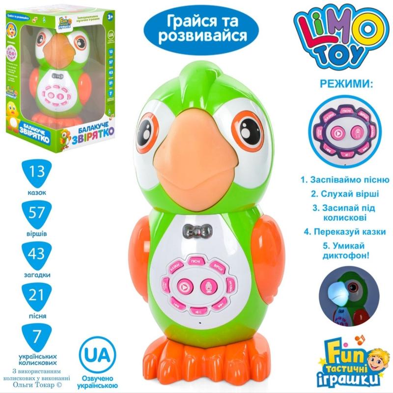 Інтерактивна іграшка Аудіо-казки Папуга – це яскрава та захоплююча іграшка для дітей, яка відтворює аудіо-казки. Папуга може розповідати різні історії, привертаючи увагу дитини та розвиваючи її уяву. Іграшка виконана у вигляді барвисті папуги з приємним голосом і простим управлінням, що робить її ідеальною для малюків. Характеристика Тип живлення: батарейки Матеріал: пластик Кількість казок: 13 Кількість віршів: 57 Кількість загадок: 43 Кількість пісень: 21 Кількість колискових пісень: 7 Мова казок: українська Світлові ефекти Музичні ефекти