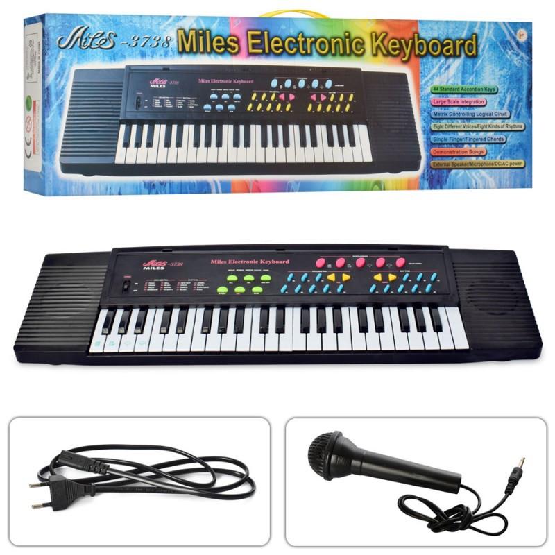 Детский игрушечный Синтезатор (3738) Синтезатор 44 клавиши, микрофон, демо запись, работает от сети, на батарейках. Ширина: 75см Материал: пластик Упаковка: коробка Габариты упаковки: 78-24-9 см