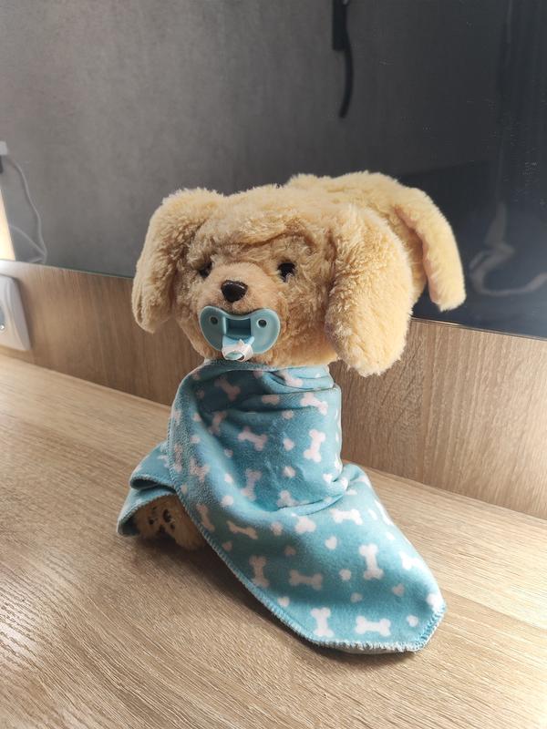 Он как такой живой и реалистичный! Он жгучий глаза и издает более 25 звуков и реакций! Если погладить щенка, то он будет открывать и закрывать глаза и хихикать от удовольствия! У собачки есть пустышка и своя пеленка, в которую его можно завернуть, чтобы он заснул. Засыпая щенок закрывает глаза и дышит совсем как настоящий! Это щенок ведет себя по-разному, это реалистичная и полностью интерактивная игрушка, лучший друг для ребенка. Он настолько приятен, что с ним так сладкий и спокойно спать. Размер собачки 26 см.