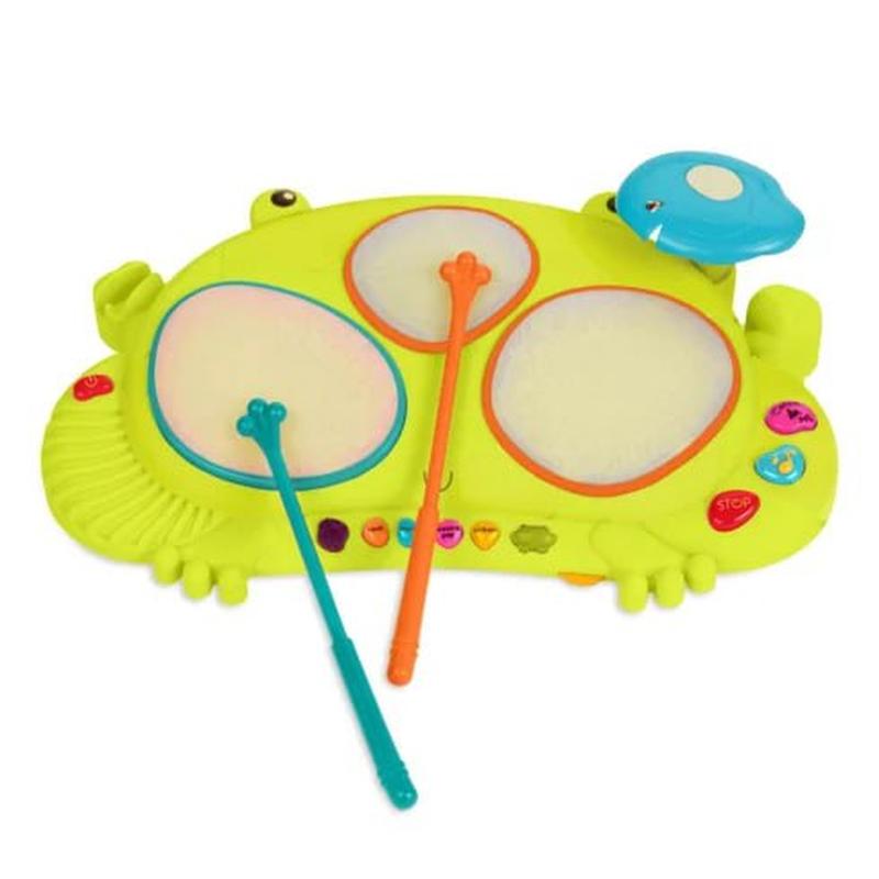 Музыкальная игрушка Кваквафон S2 со светом и звуком. Это веселее целого лягушка хор! Барабанная установка, на которой можно играть без музыкального сопровождения или под аккомпанемент в одном из четырех музыкальных стилей. Выбирай, чем больше тебе нравится - рок, этно, электропоп или урбан! Специальная кнопка превращает звуки барабанов в забавное купание Кваквафона. В игрушке записаны несколько мелодий, которые также можно сопровождать игрой на барабанах. У Кваквафона есть также интересная игра "Спеймай огонька". Имеющая регулировку громкости и кнопка, которая останавливает все звуки. Музыкальная игрушка Кваквафон поможет в развитии: музыкального слуха; креативности; воображения. Развивающие игрушки Battat — будь музыкальным. Будь веселим. Будь собою! Размеры: 25.4 х 43.18 х 12.7 см Питание - 4 батарейки типа АА (в комплекте). P.S. в комплекте только одна палочка (как на фото)