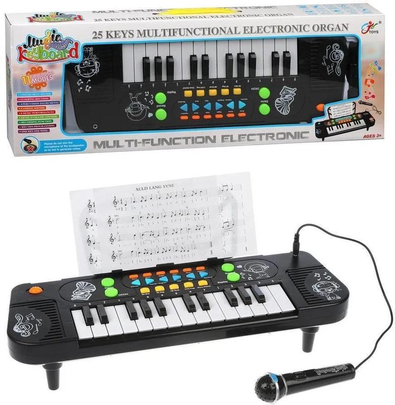 Детский синтезатор с 25-ю клавишами отличный тренажер для начинающего музыканта. В процессе игры ребёнок будет развивать музыкальный слух, фантазию и творческое начало. Музыкальный инструмент работает от 3-х батареек типа АА на 1,5 V (не входят в комплект). Размер синтезатора (ДхШхВ) составляет 41х14х8 см. Изделие изготовлено из прочного пластика, безопасного для детей. Характеристики: 4 инструментальных звучания (пианино, орган, виолончель, гитара); 4 ритма (slo rock, rock, new, disco); 4 ударных (bass drum, snare drum, hi-hat, cymbal); 4 звука животных (птица, собака, утка, лягушка); 8 музыкальных композиций; 8 уровней громкости; функция записи; функция программирования ритма. В комплекте прилагается микрофон.