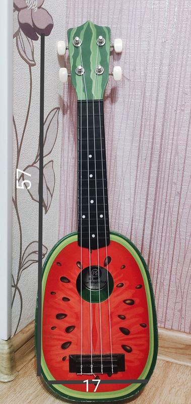 Яркая четырехструнная гитара оригинального дизайна в виде фруктов. Имеет нейлоновые струны и колки, которые регулируют натяжение струн. Особенности гитары: - гитара сделана из пластика, что делает ее очень легкой, - милое оформление, благодаря которому ребенку захочется играть на нем свои песни с большим удовольствием, - имеет 4 струны с регулируемым вырезом - небольшой размер поместится в руках каждого маленького музыканта Возрастом 3-8 лет.