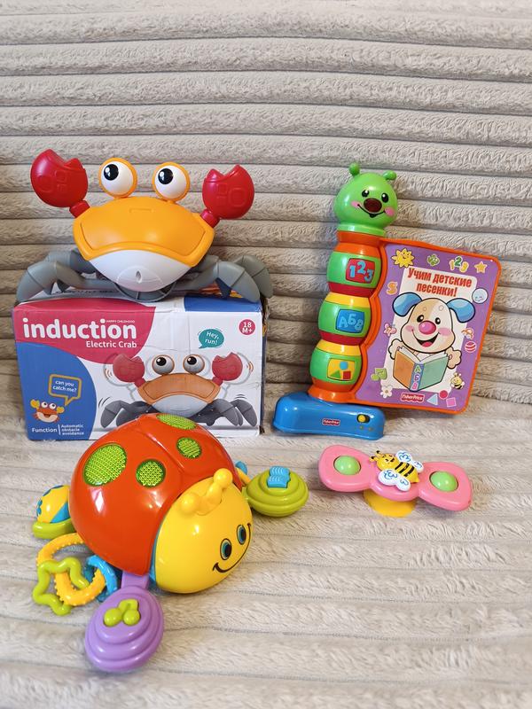 Все игрушки работают в комплекте с батарейками Краб новый, не пользовались,бо был еще один подобный Цена за лот без краба 220грн, если вместе с крабом отдам за 370 грн Отдельно краб 220грн,солнечко 150грн,книжка 120грн,спиннер в подарок
