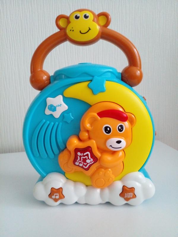 Проектор в коробке Проектор-ночник «Мишка на луне» подарит незабываемые ощущение малышу и наполнит комнату волшебством и приятной атмосферой для отдыха.При включении игрушки, луна светится. Каждая кнопка, которые выполнены в виде звездочки, запускает звуковые эффекты: приятные мелодии, звуки природы и колыбельные. В разных режимах есть возможность совмещать несколько звуковых эффектов сразу. Переключатель режимов находится на корпусе игрушки сбоку. Там же вы найдете кнопку, которая запускает проектор и способы его работы (с мелодией и без).Проектор выводит красочное изображение с графикой Full HD. Животные по очереди сменяют друг друга и веселят маленького непоседу.Работает игрушка от 4х батареек 1.5V АА типа (не входят в комплект). Состояние идеальное, есть родная коробка