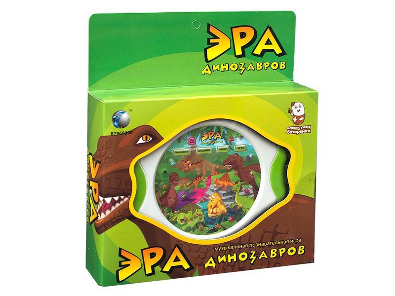 Музыкальная познавательная игра "Эра динозавров" - развивающая игра для детей. Игрушка похожа на приставку, проста в обращении. По центру располагается картинка с изображениями динозавров и некоторых насекомых. Есть кнопки вкл./выкл., регулировки громкости, режимов игры - травоядные, хищники, звуки и игра. Задача игры - нажимая на выпуклые кнопки, находящиеся рядом с динозаврами и насекомыми, в режимах "травоядные" и "хищники" найти соответствие. Нажав правильно на кнопку, "голос" расскажет информацию о животном. В режиме "звуки" можно узнать, какие звуки издают динозавры и насекомые. В режиме "игра" будет задана задача на поиск животных по названиям. "Голос" подскажет, правильно ли был выбран ответ.