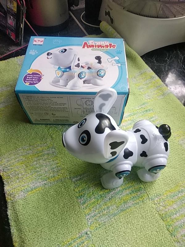 Продам детскую игрушку собачка-долматин.на батарейках под музыку ездит(танцует)по полу.меняет цвет над ошейником.состояние новой вещи.