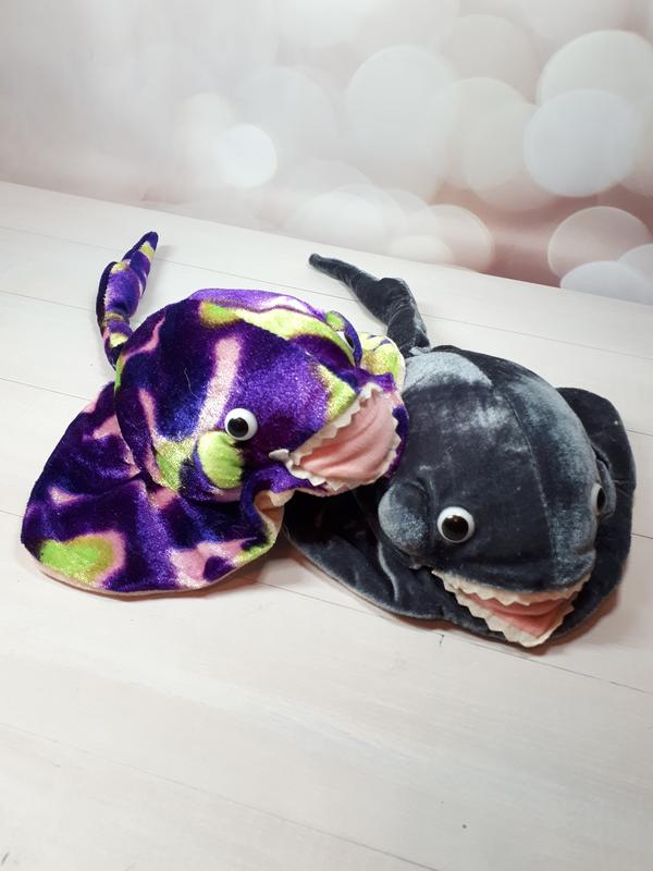 Дві м'які дитячі іграшки-скати. Вартість за 2 іграшки. Іграшки у дуже гарному стані, чістеньки без плям, не були в користуванні. Розмір ската 20х25 см (розмір без хвоста).