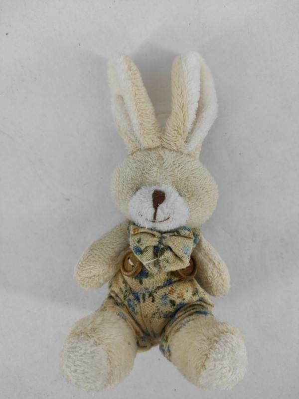 В комбинезоне с деревянными пуговицами. Очень милый.