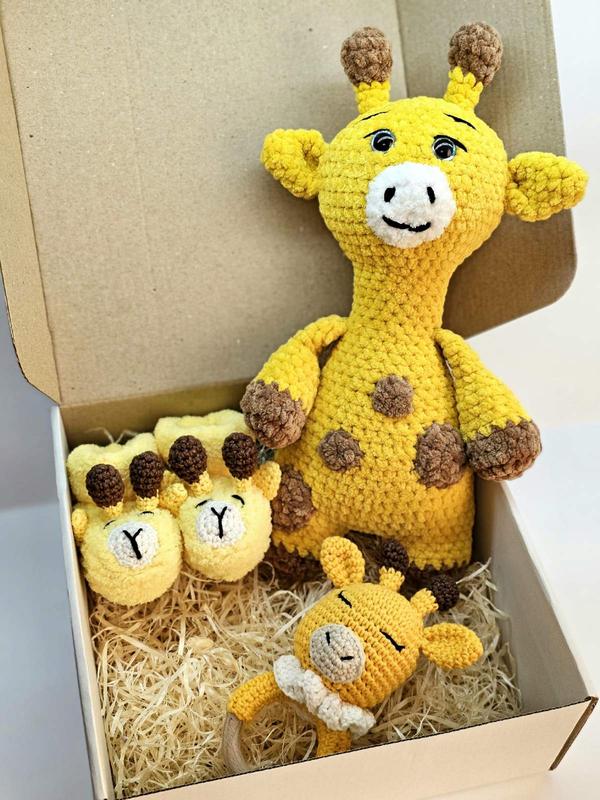 Продам набор с жирафятками. Выполнен из гипоаллергенной пряжи, очень мягкий на ощупь. Цена: жирафенок - 600 грн. пинетки - 220 грн. грызунок-погремушка - 200 грн. Также можно приобрести все отдельно.