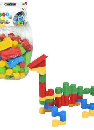 Пластиковый яркий конструктор. Большие детали, для детей от года. Есть детали для постройки домиков, зверей, интересных фигур и еще многих увлекательных вещей. Выполнено из качественного и прочного пластика. В наборе 58 элементов.