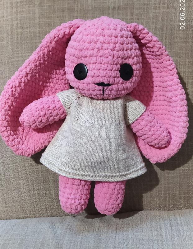 Вязаный крючком зайчик, набивка холлофайбером.Плачко связано с шершавой пряжи спицами.Очень приятен на ощупь.Выста,без ушей,33см.