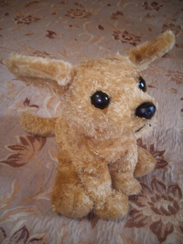 Руденький песик. Дуже мила і приємна на дотик м'яка іграшка. Заввишки близько 18-20 см. В лежачому стані довжина близько 26 см. У лапках кульки для моторики пальчиків дитини. Стан відмінний, ним не гралися. Можливий самовивіз або зустріч у Вінниці. Або відправлю будь-яким перевізником.