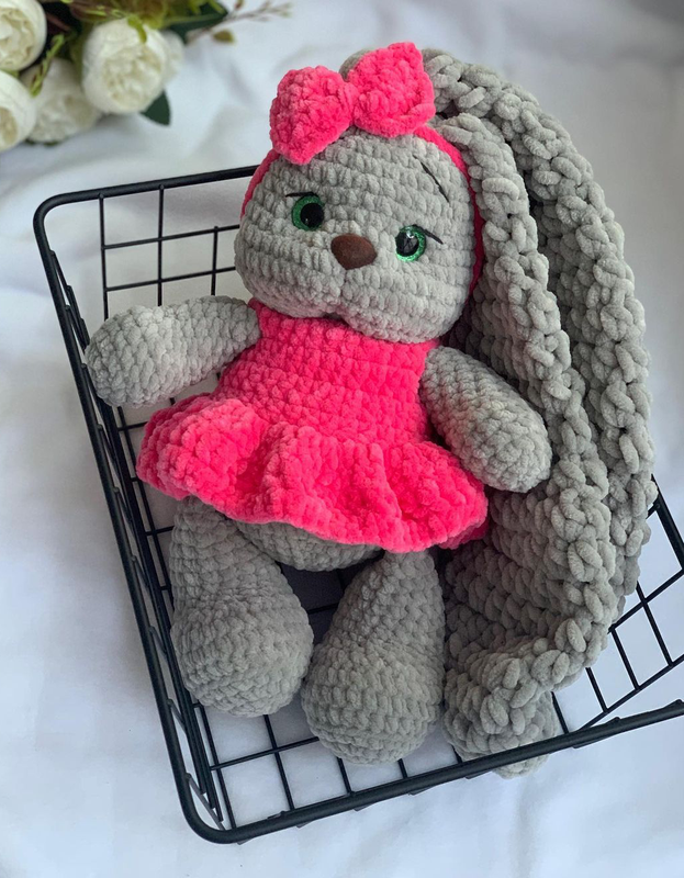 ніжна зайка из плюшевой пряжи ручки и ножки ввязаны в тело глаза и носик на безопасном креплении ручная работа одежда снимается